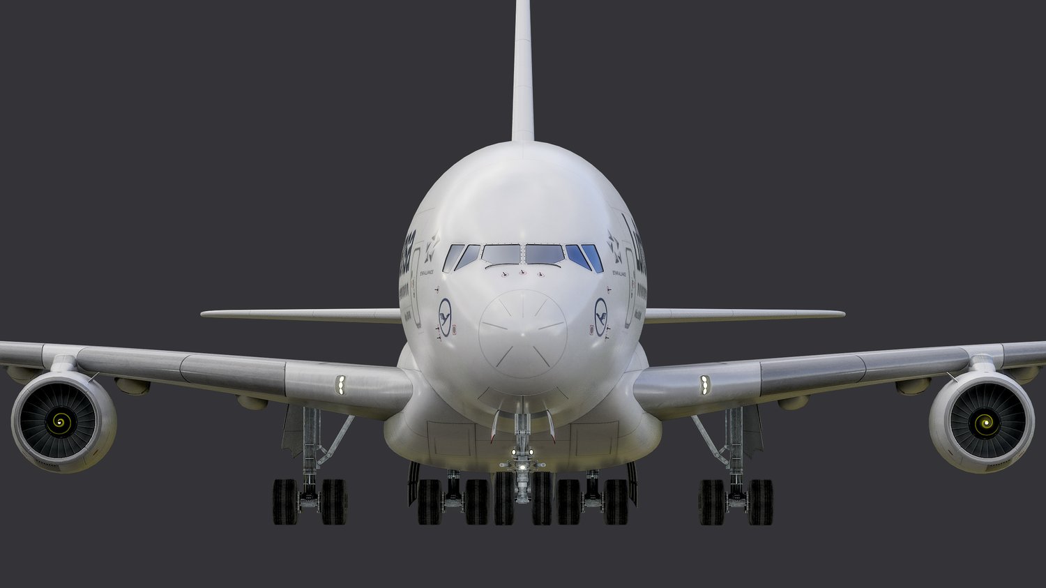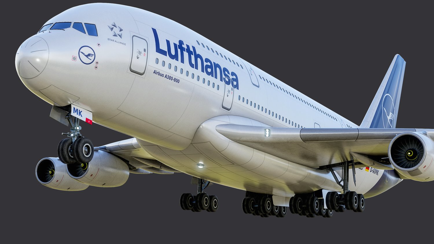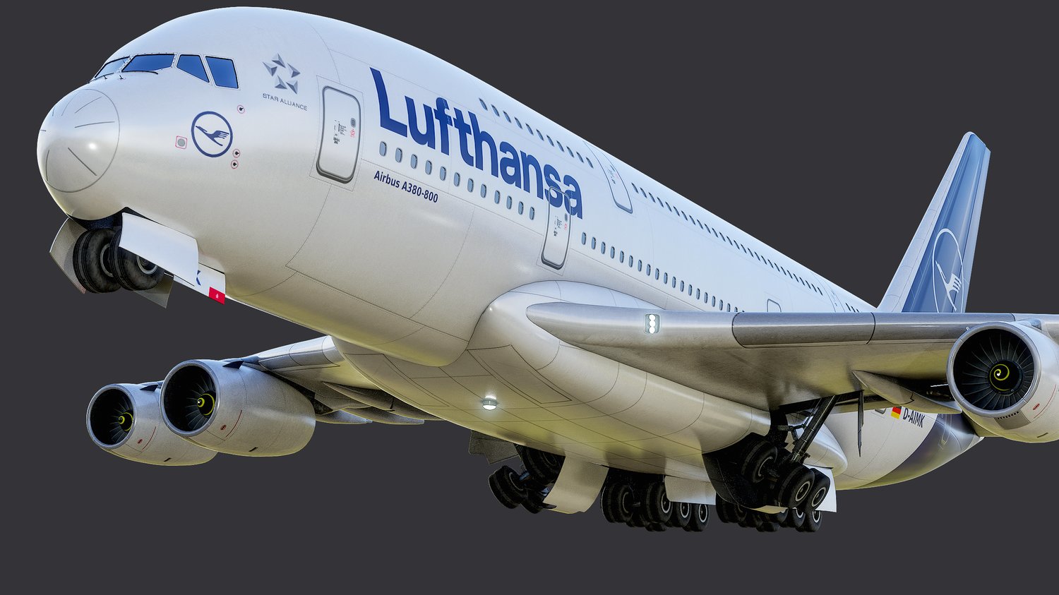 Animated Airbus A380-800 airliner exterior with present Lufthansa livery (2025). Pinpointed mesh reproduction, high fidelity livery, AAA render ready, day & night scenes ready, multiple animations included.