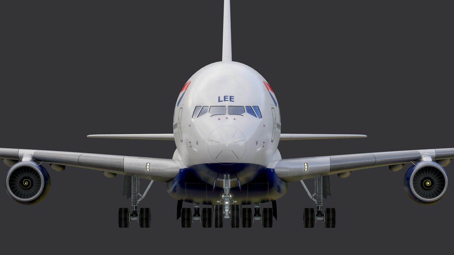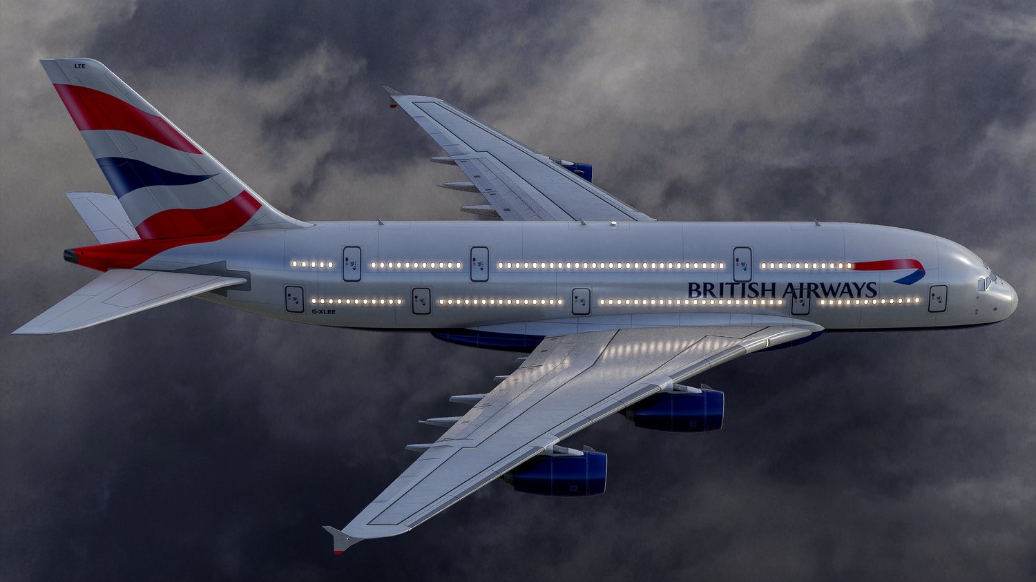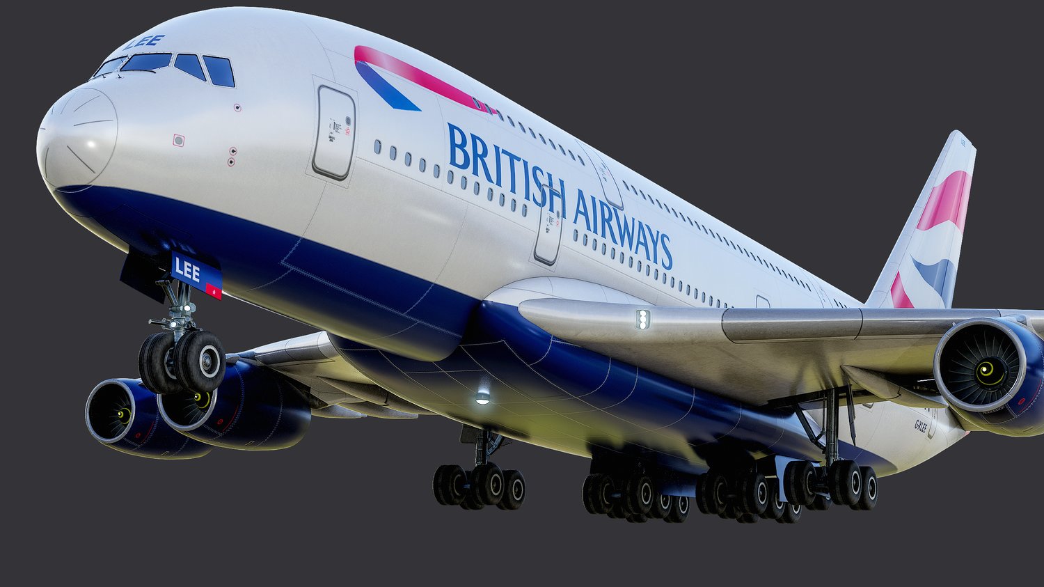 Animated Airbus A380-800 airliner exterior with present British Airways livery (2025). Pinpointed mesh reproduction, high fidelity livery, AAA render ready, day & night scenes ready, multiple animations included.
