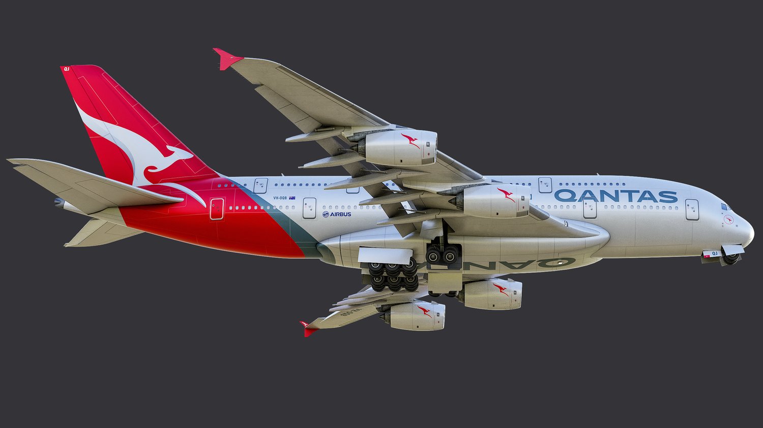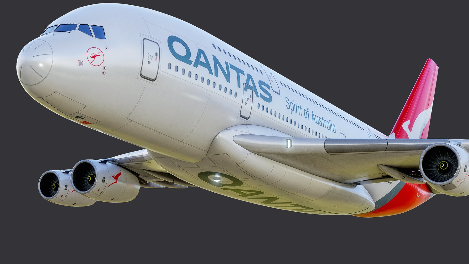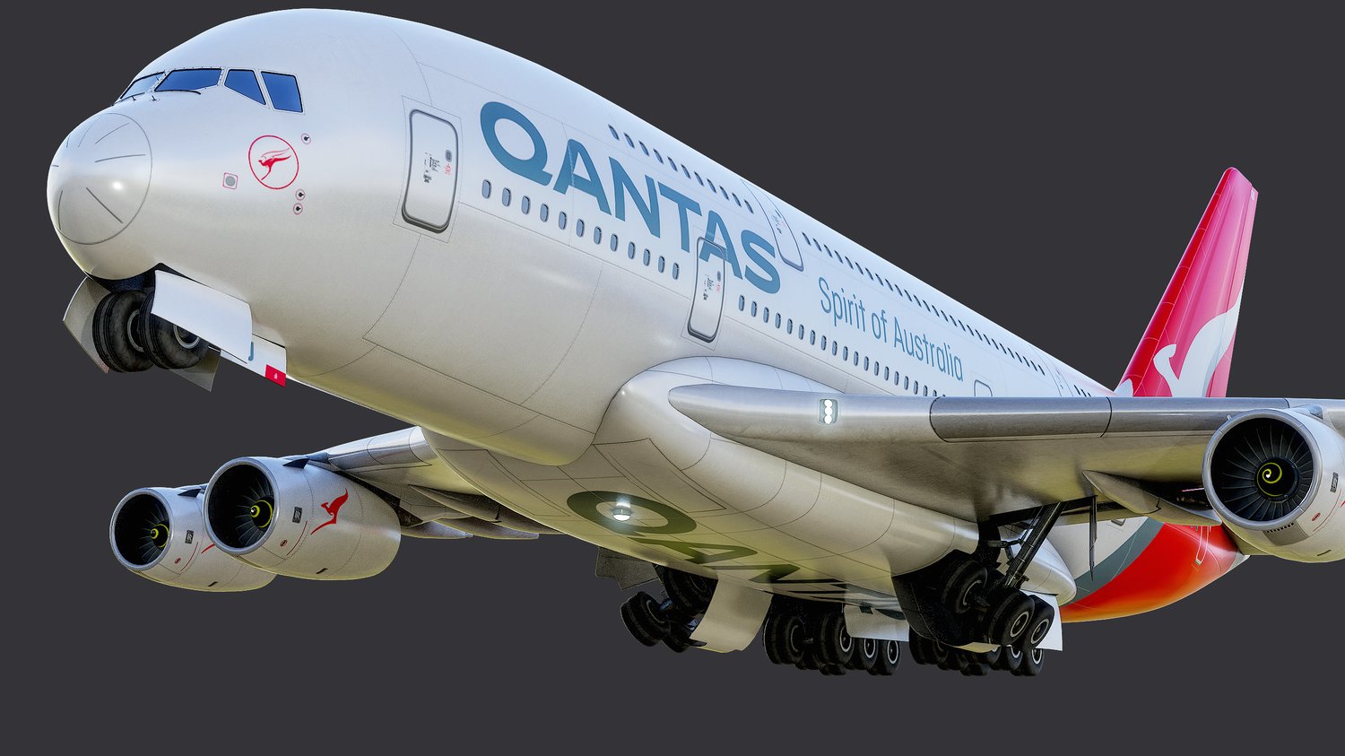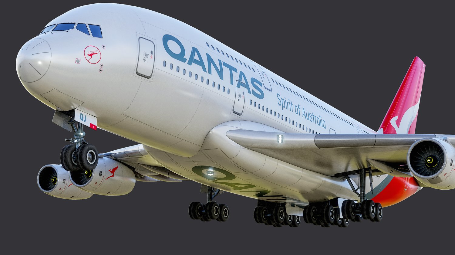 Animated Airbus A380-800 airliner exterior with present Qantas Airways livery (2025). Pinpointed mesh reproduction, high fidelity livery, AAA render ready, day & night scenes ready, multiple animations included.