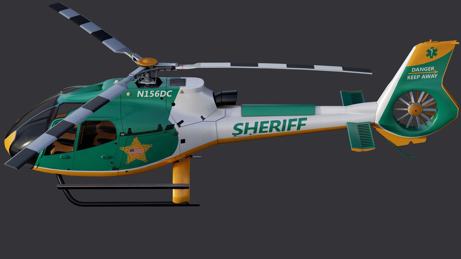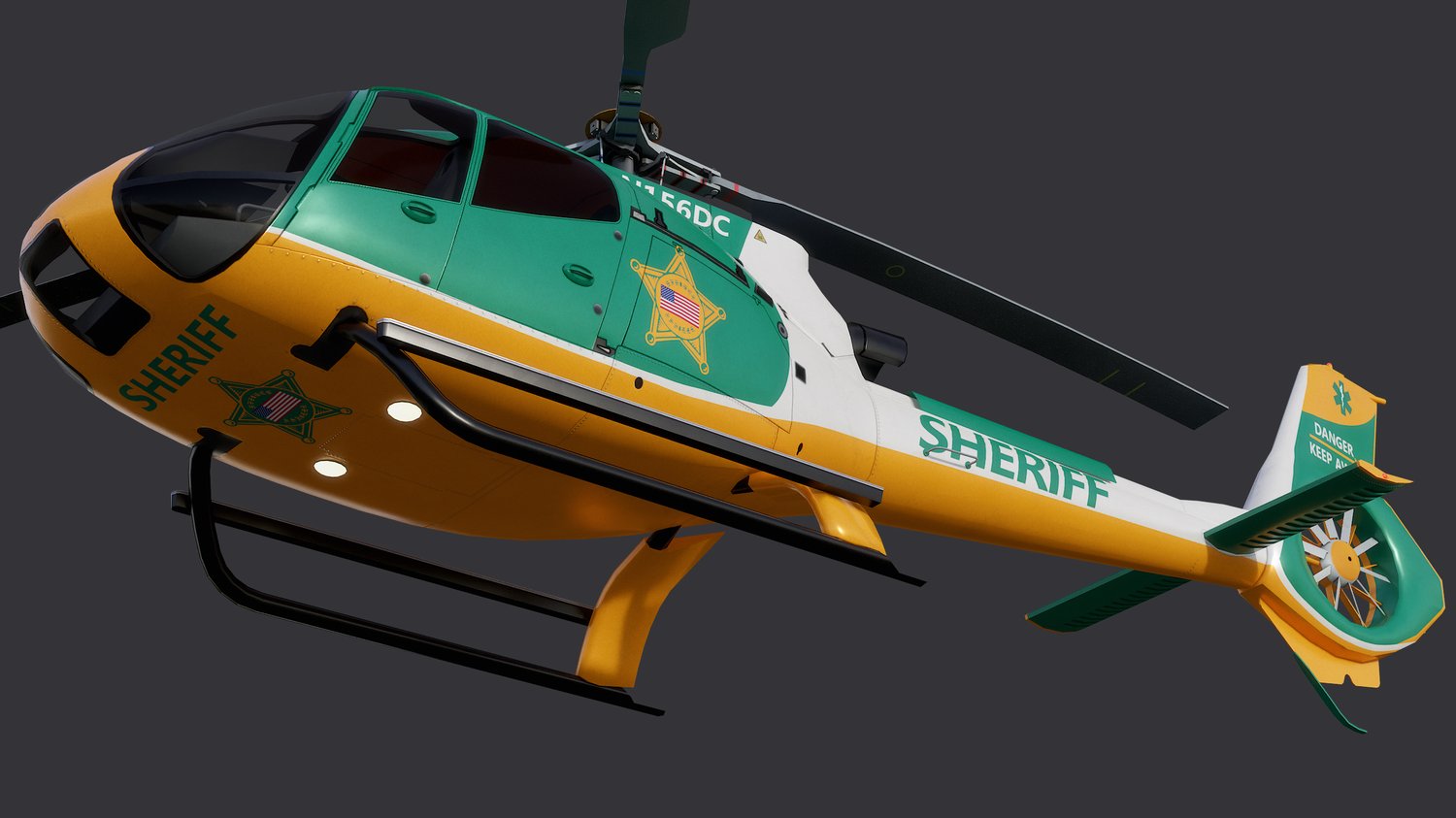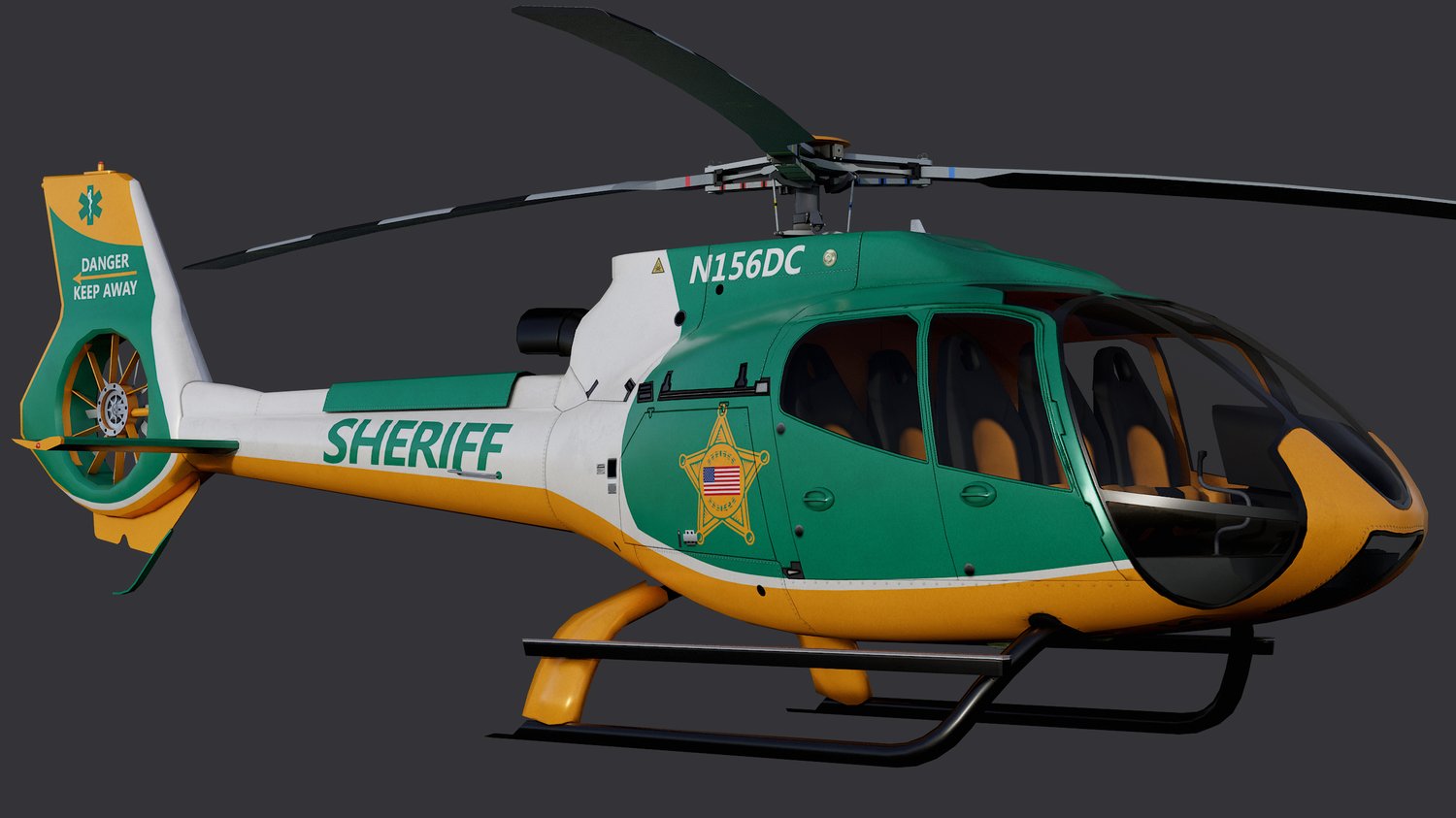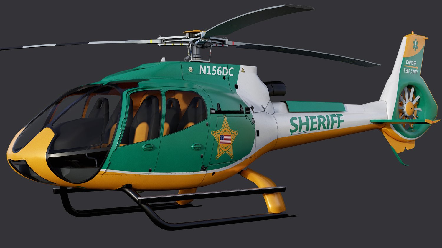 Animated Airbus H130 helicopter exterior & interior with fictive US Sheriff livery. Pinpointed mesh reproduction, unique livery, 4 x LOD, PBR textures, day & night cycles ready, animated rotors.