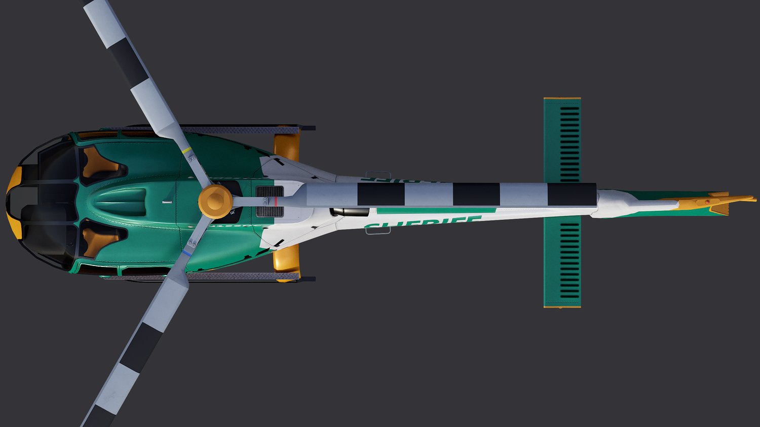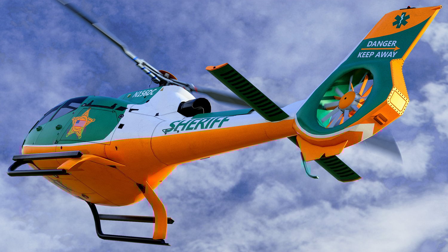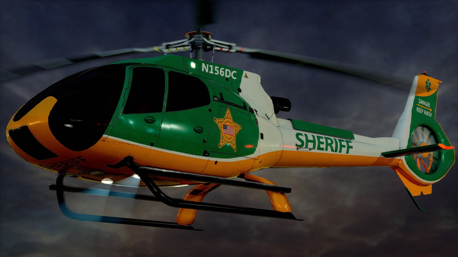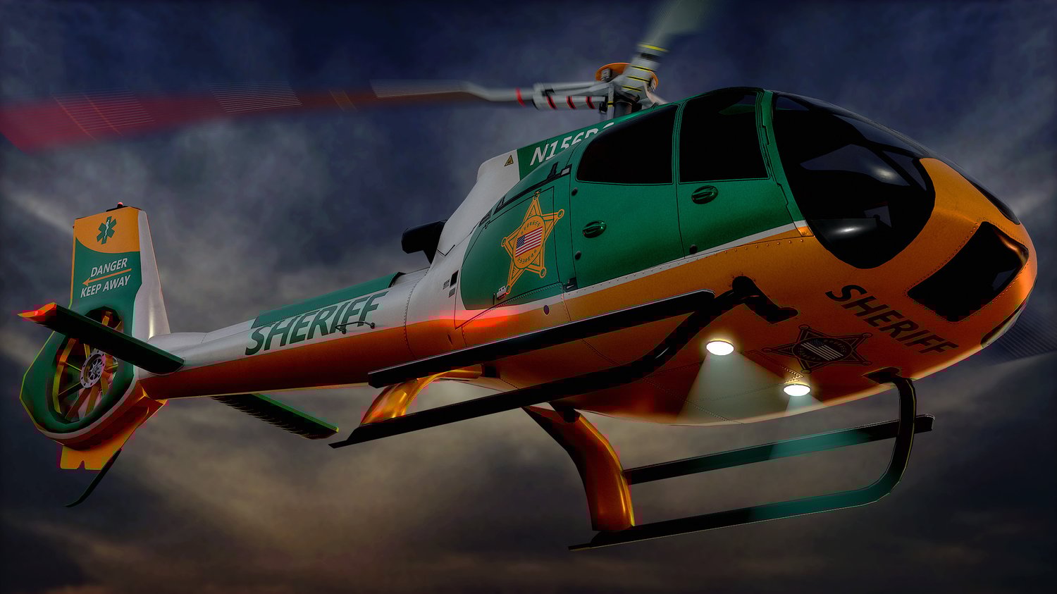 Animated Airbus H130 helicopter exterior & interior with fictive US Sheriff livery. Pinpointed mesh reproduction, unique livery, 4 x LOD, PBR textures, day & night cycles ready, animated rotors.