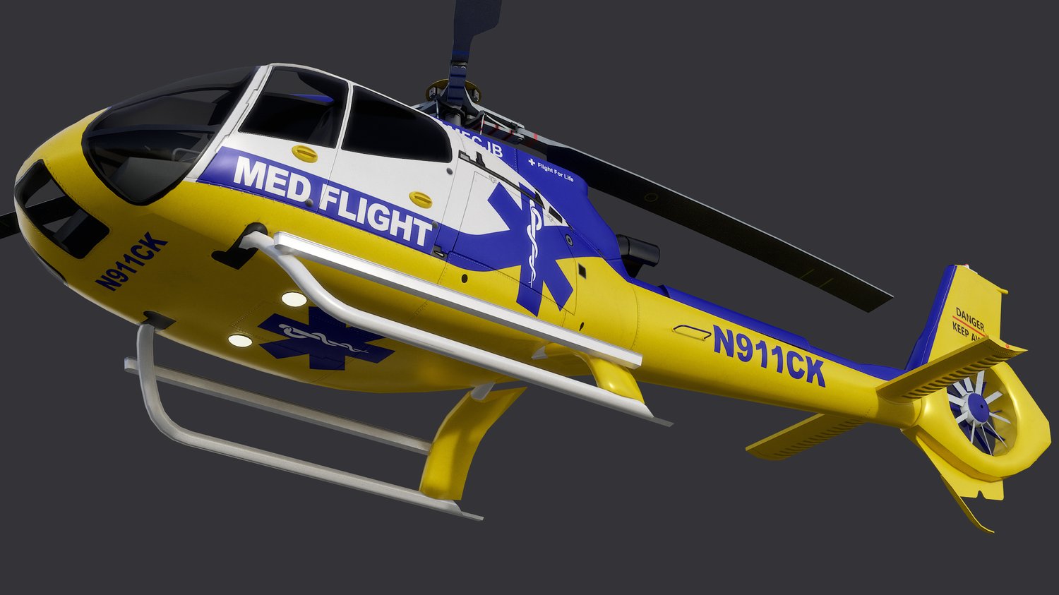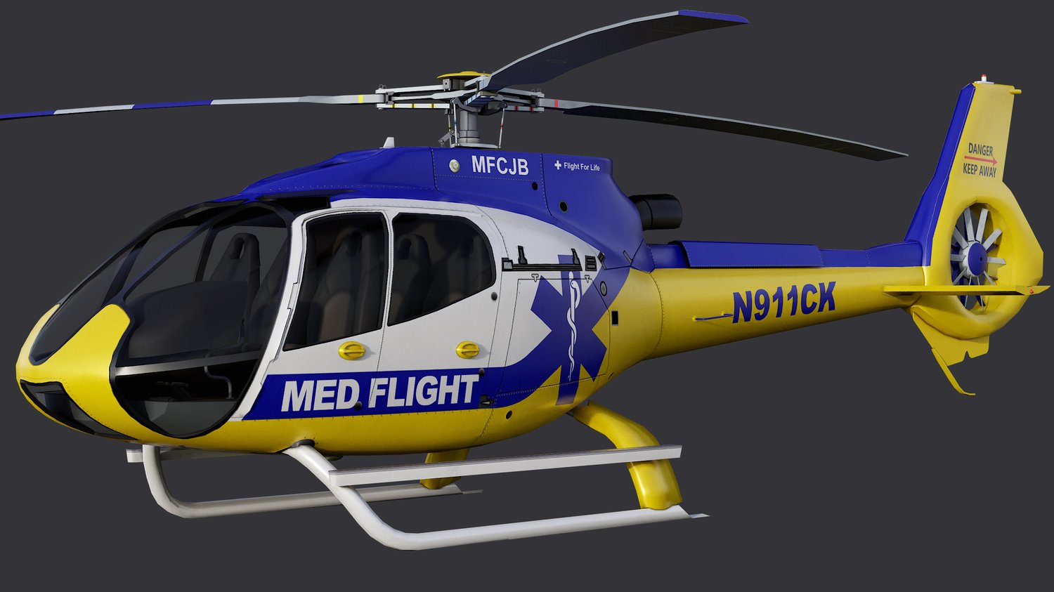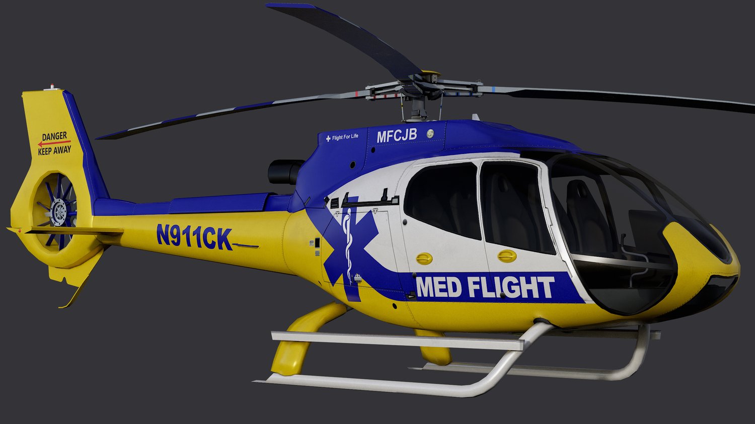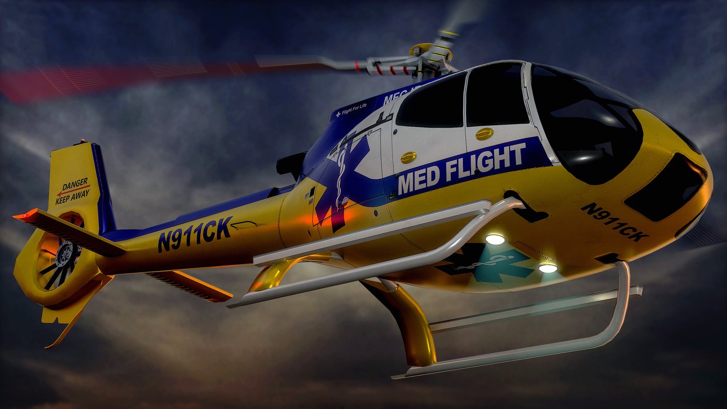 Animated Airbus H130 helicopter exterior & interior with real-life Med Flight livery. Pinpointed mesh reproduction, high fidelity livery, 4 x LOD, PBR textures, day & night cycles ready, animated rotors.