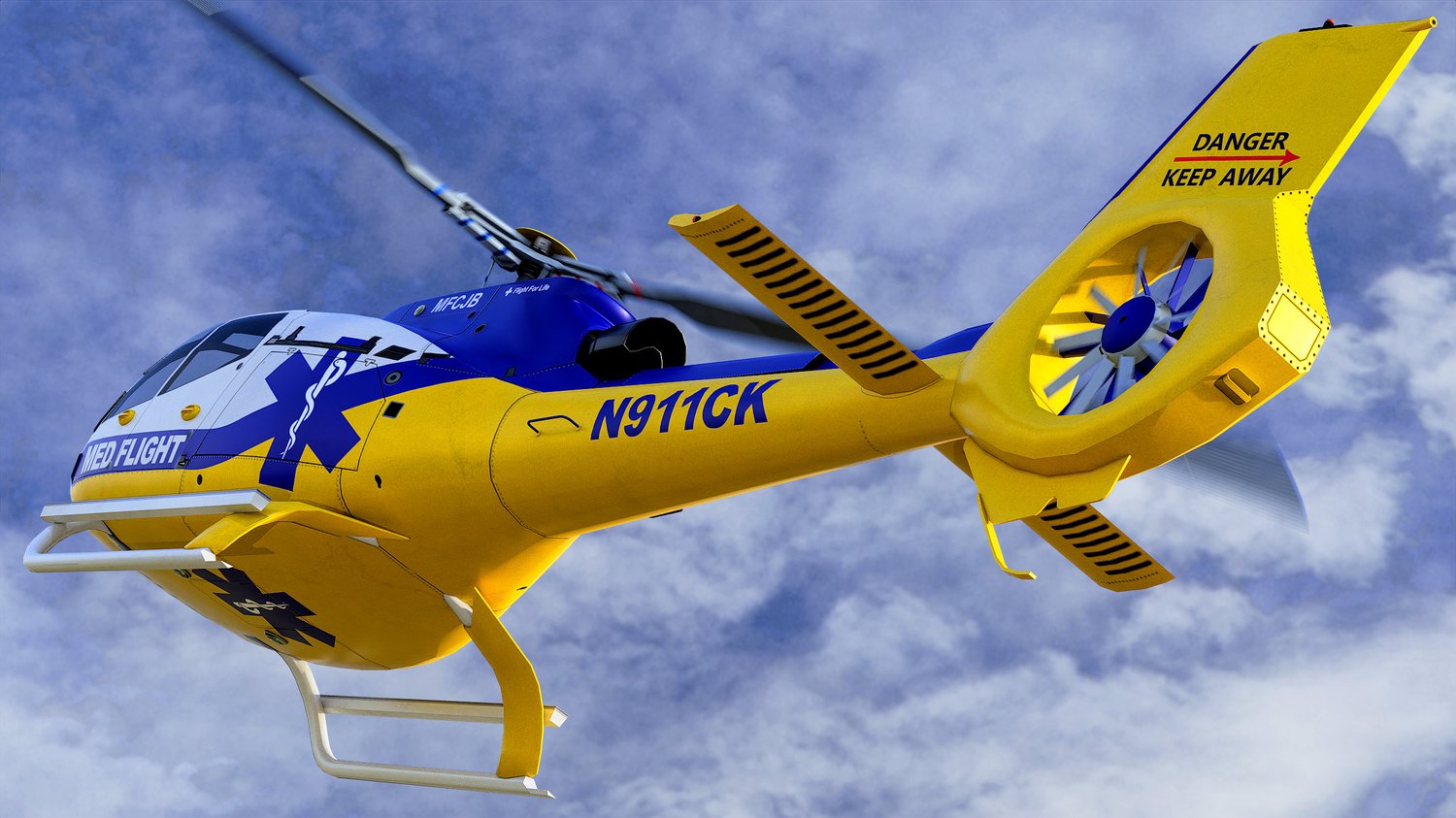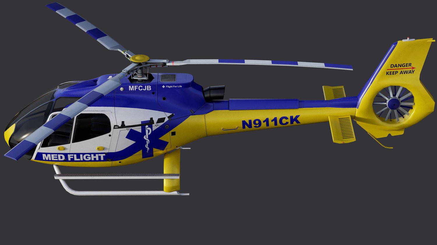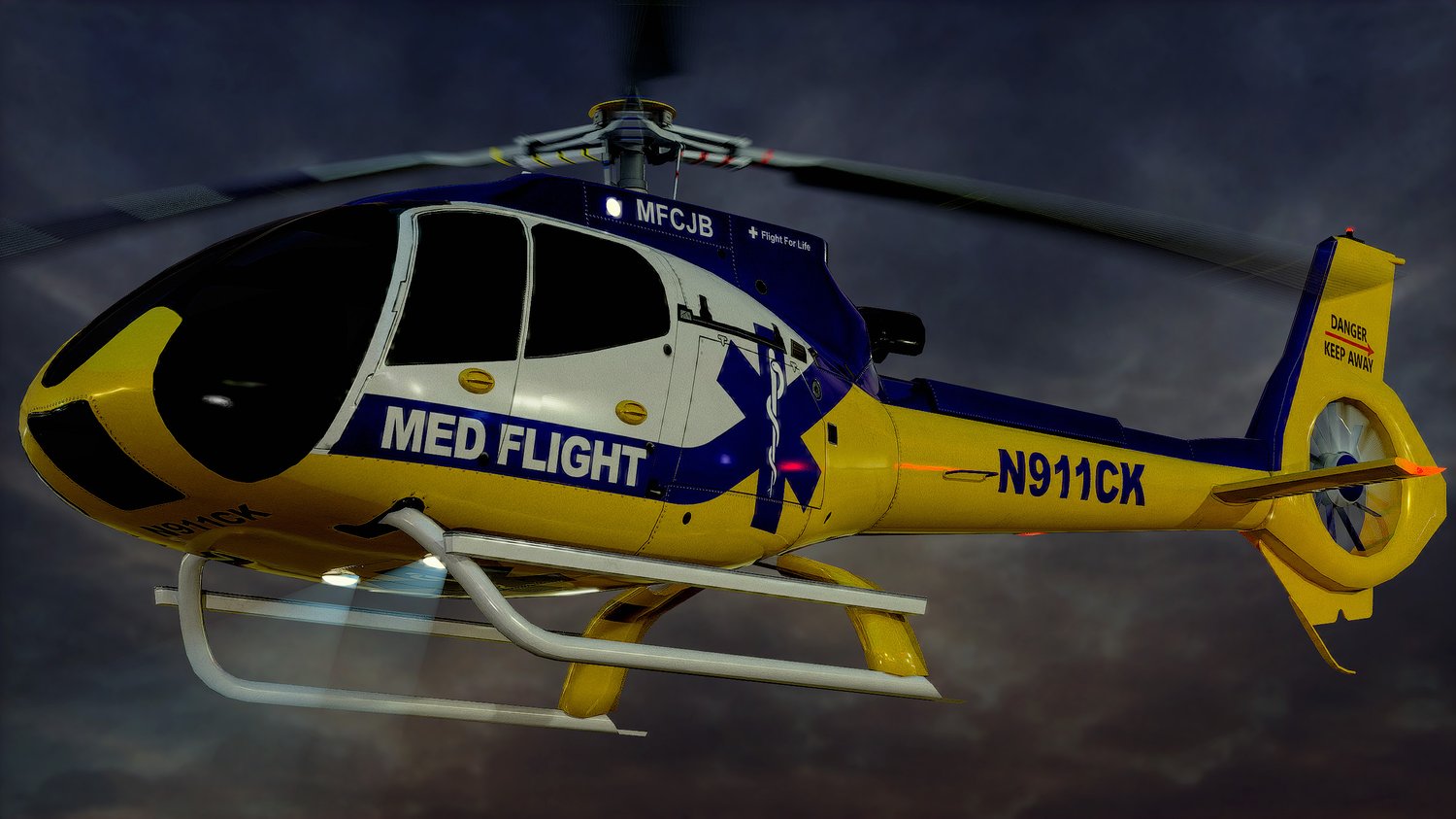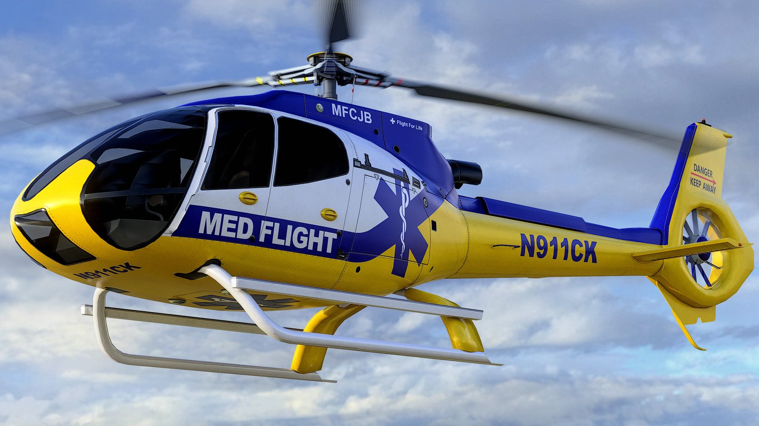 Animated Airbus H130 helicopter exterior & interior with real-life Med Flight livery. Pinpointed mesh reproduction, high fidelity livery, 4 x LOD, PBR textures, day & night cycles ready, animated rotors.