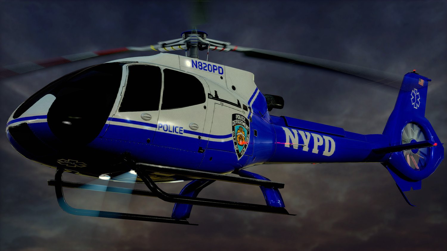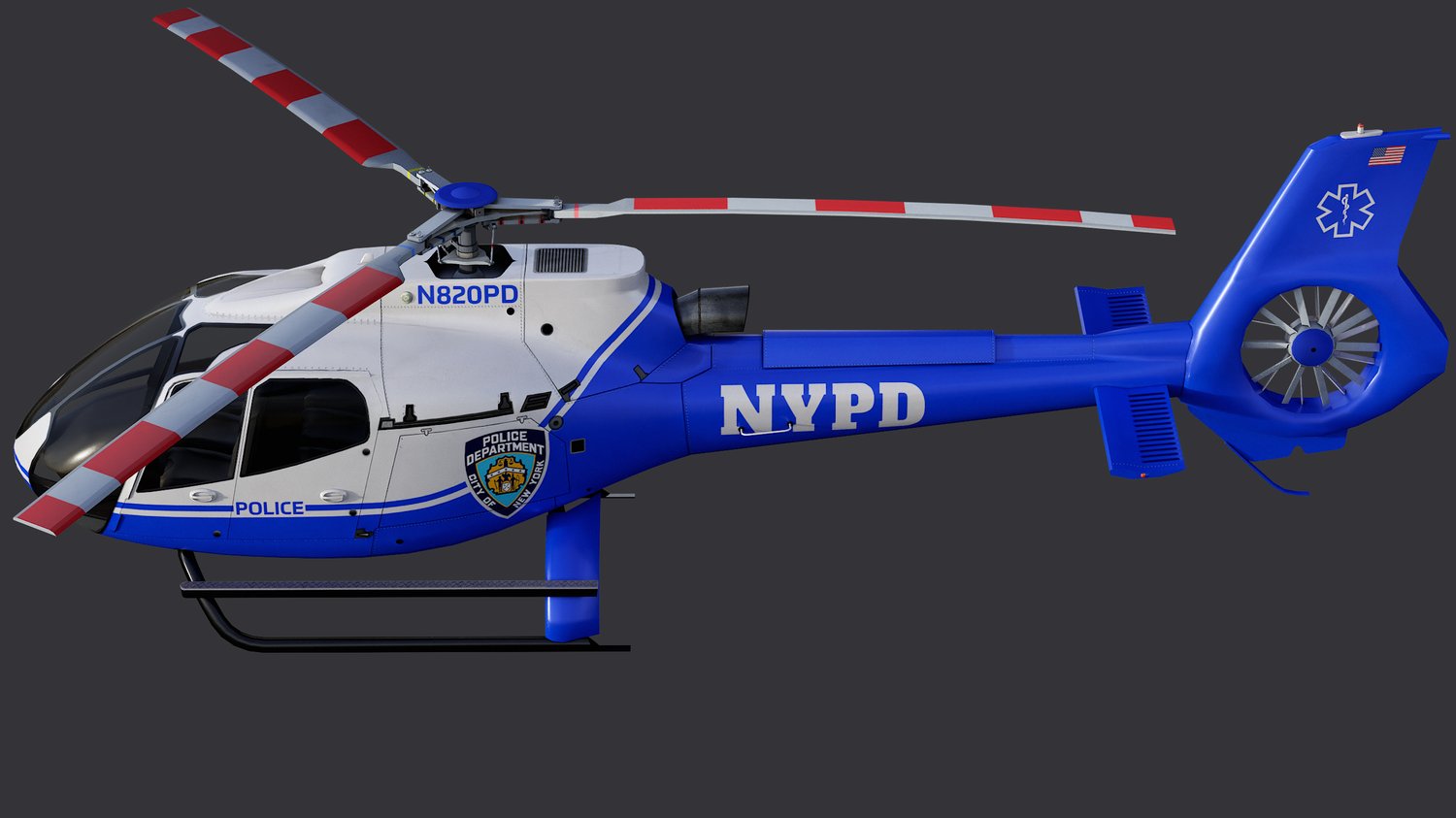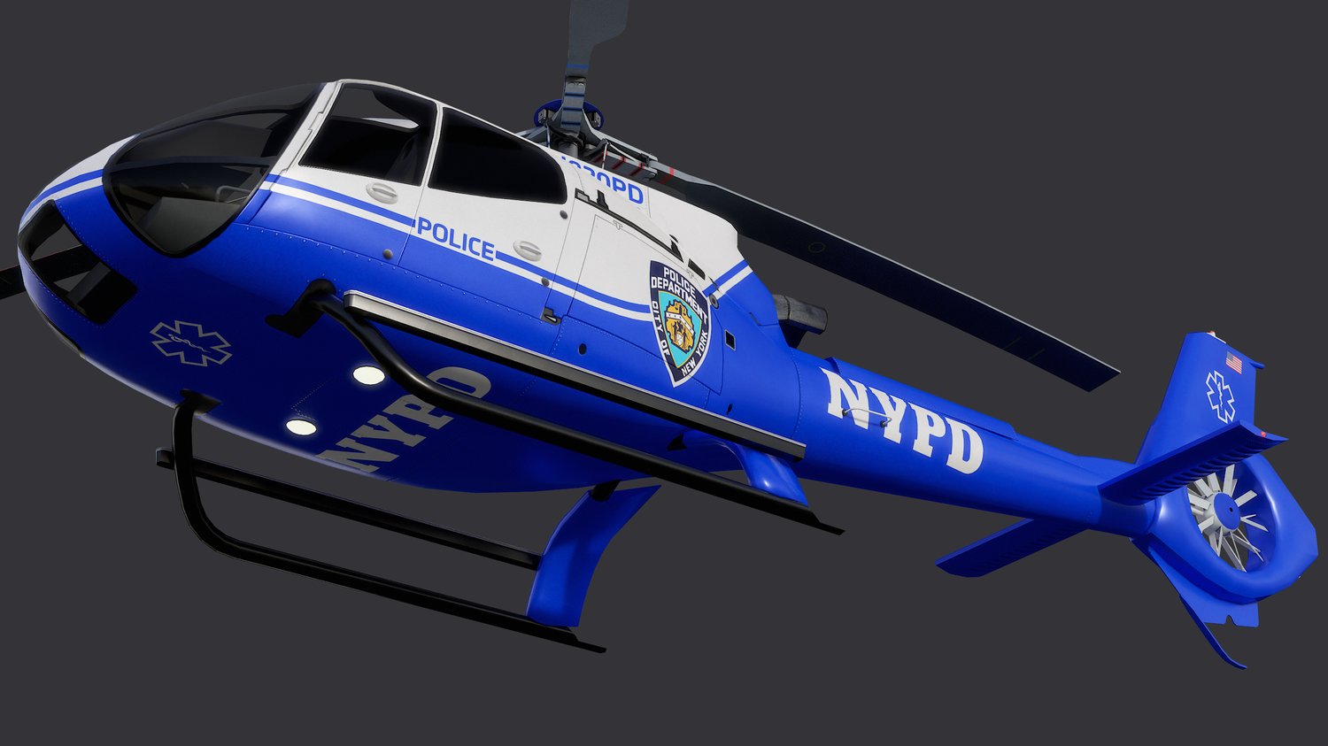 Animated Airbus H130 helicopter exterior & interior with real-life NYPD livery. Pinpointed mesh reproduction, high fidelity livery, 4 x LOD, PBR textures, day & night cycles ready, animated rotors.