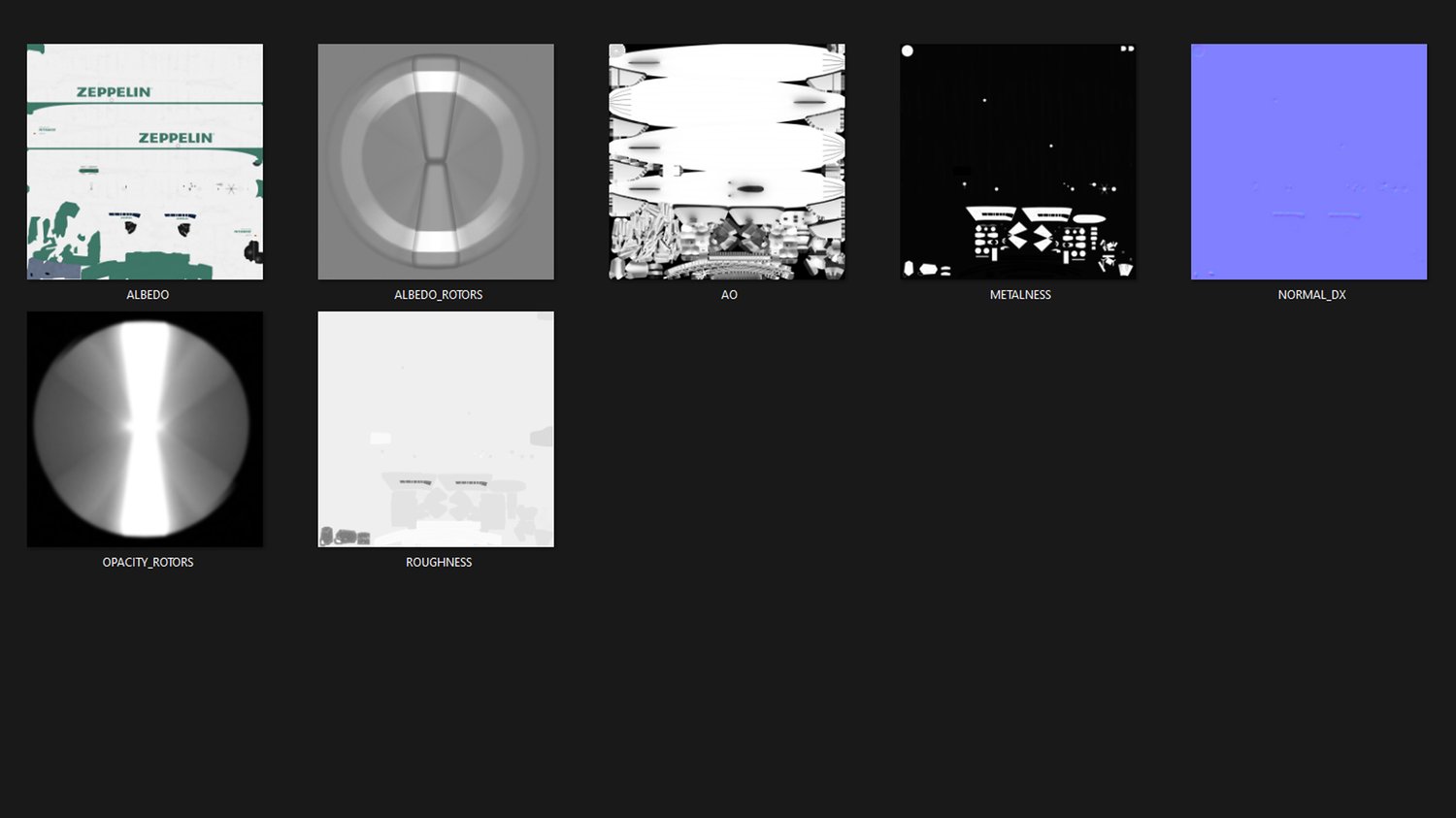 PBR metallic roughness ready with 7 x textures. The native texture resolution are 4096 x 4096 px for the airship blimp with fuselage, gondola, rudder, tail and engines, and 512 x 512 px for propellers.