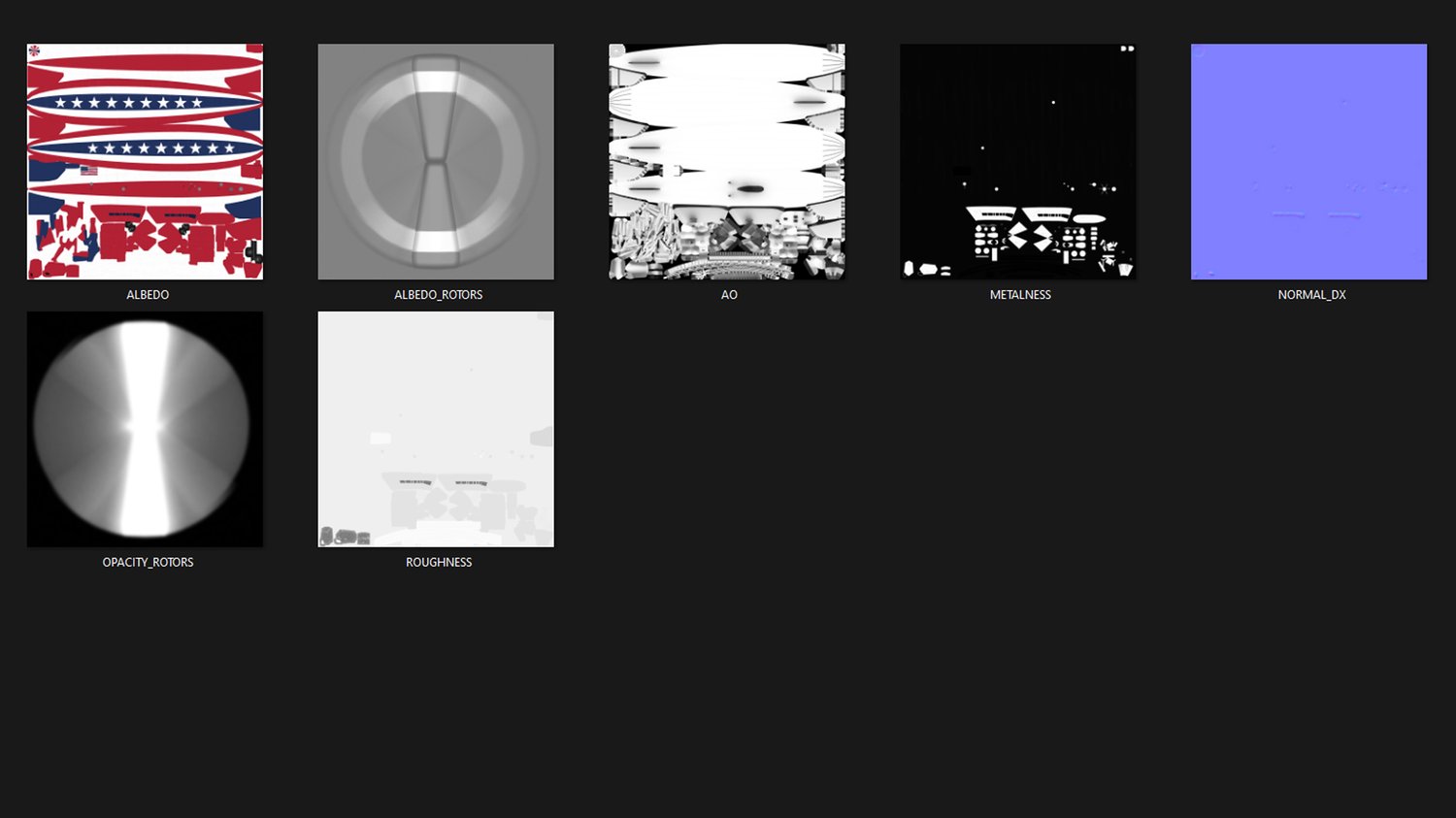 PBR metallic roughness ready with 7 x textures. The native texture resolution are 4096 x 4096 px for the airship blimp with fuselage, gondola, rudder, tail and engines, and 512 x 512 px for propellers.