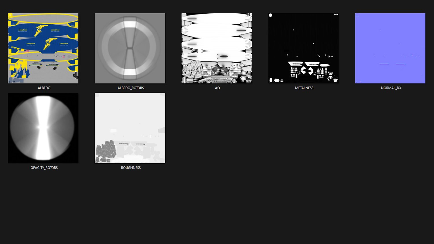 PBR metallic roughness ready with 7 x textures. The native texture resolution are 4096 x 4096 px for the airship blimp with fuselage, gondola, rudder, tail and engines, and 512 x 512 px for propellers.